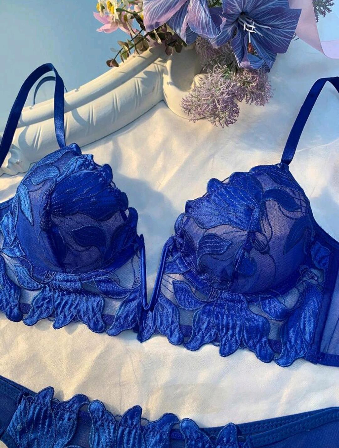 Elegante, sofisticado e extremamente sensual. Este conjunto de lingerie em tom azul intenso foi desenvolvido para realçar a beleza natural do corpo feminino com muito charme.