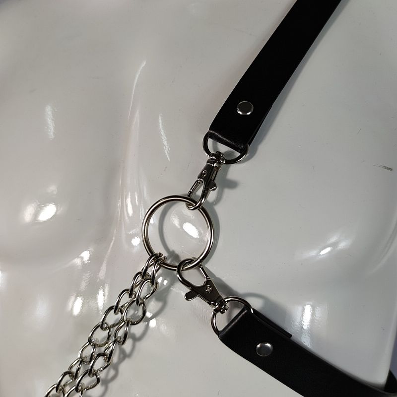 Confeccionado em couro sintético com detalhes em rebite, correntes e fivelas para ajuste que prendem a peça. Descubra novas sensações.