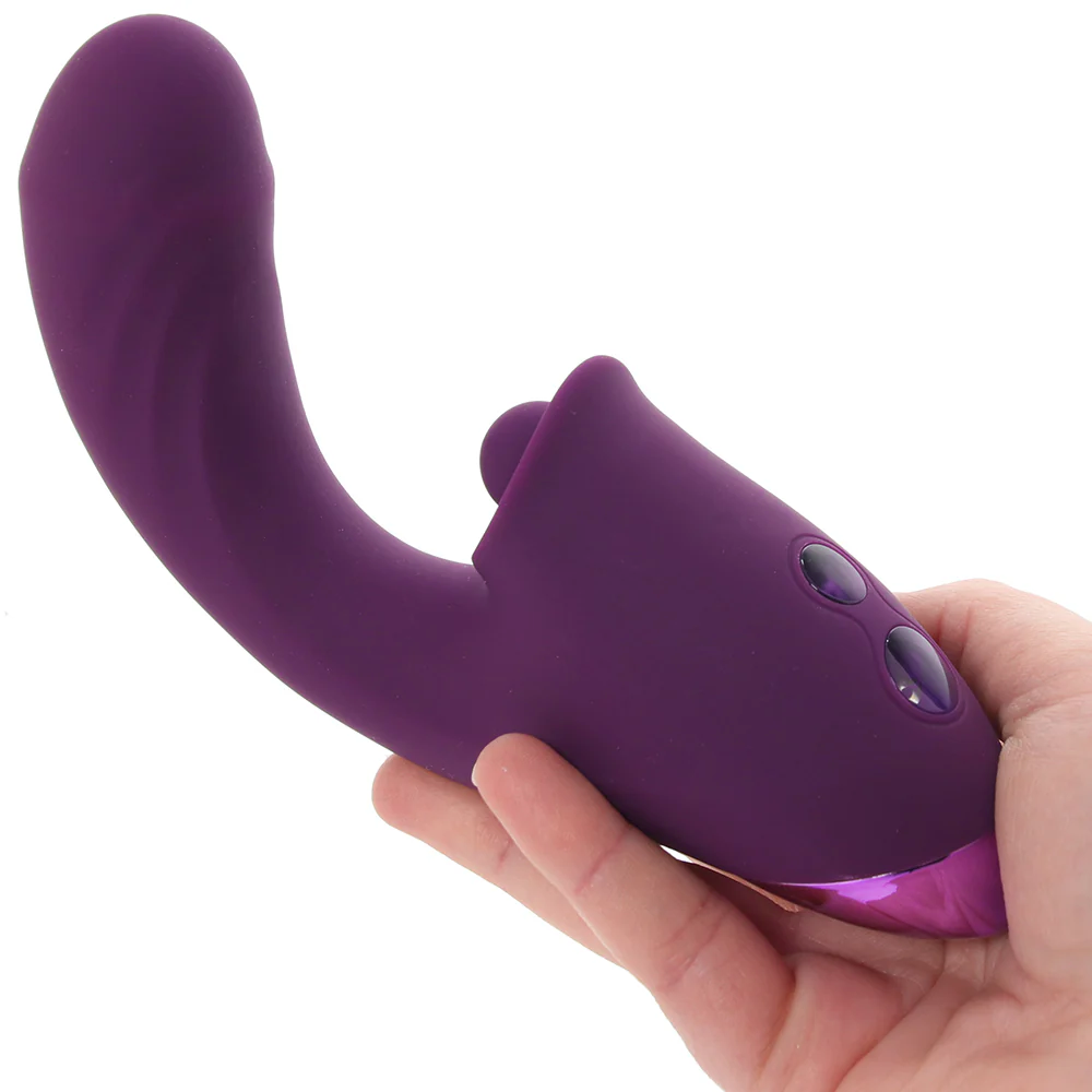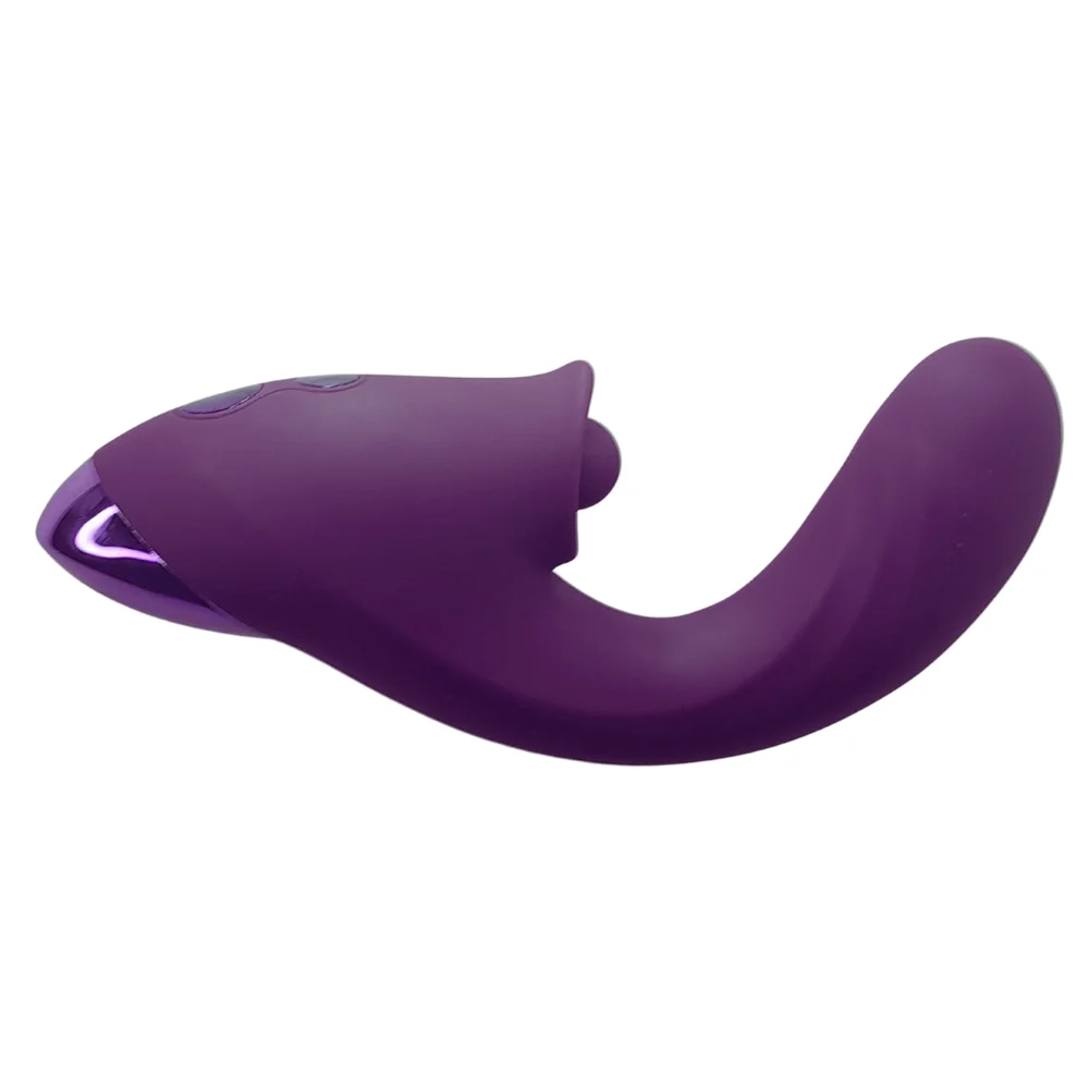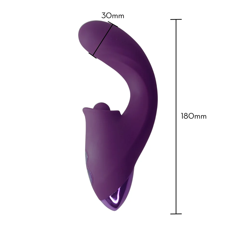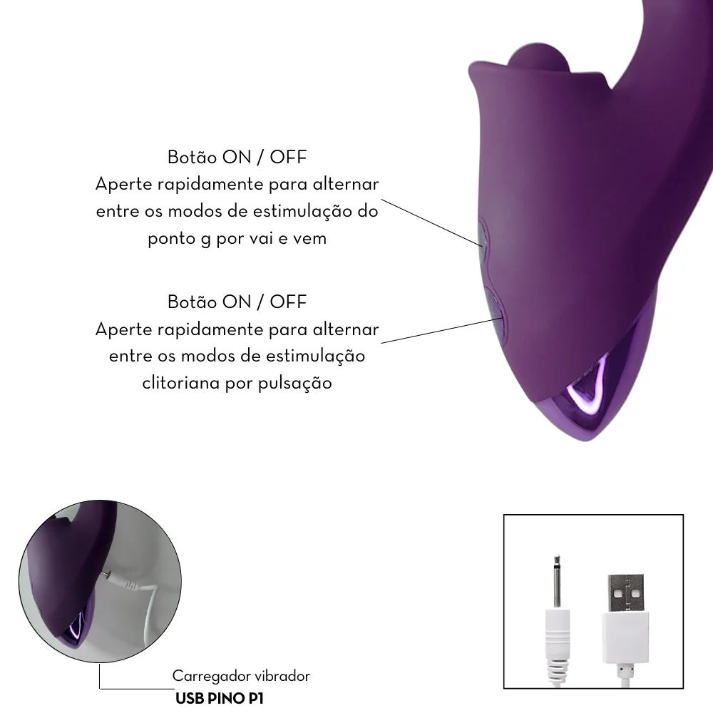 Vibrador estimulador duplo, sendo: Um estimulador com 5 modos de estímulo do ponto G por movimentações em vai e vem e um estimulador clitoriano por pulsação com 10 modos de vibração. Possui toque suave, aveludado, detalhes metalizados e ressaltos estimuladores.